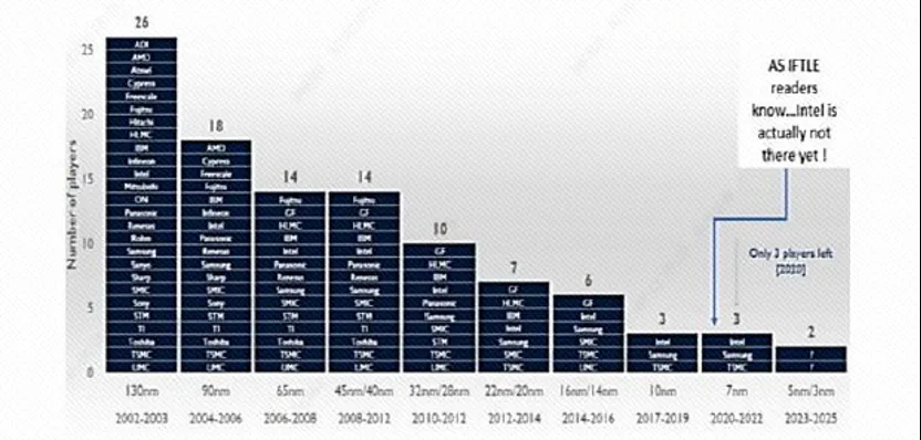 而从另一方面来理解,摩尔定律的代价是更高的投入成本,这也为后来者提供了更强的进入门槛。这个定律天生适合于龙头集中的产业,因为优化了龙头企业的长期竞争格局。从下图可看出,越往先进制程演进,玩家数量就越少,到3纳米只有寥寥几个玩家参与。